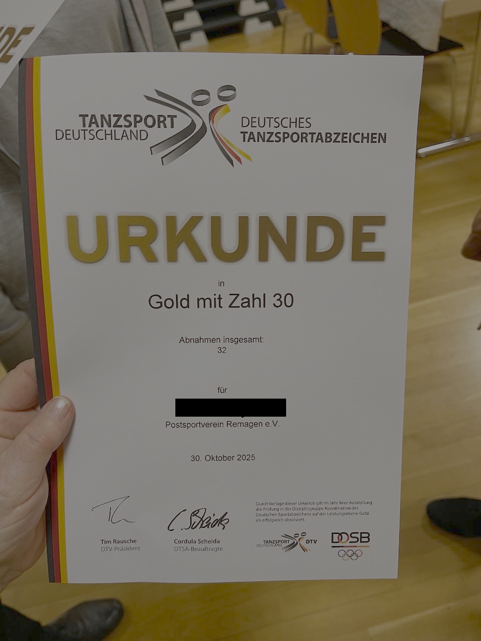Tanzen ist gesund, hält jung, bringt Freude und Freunde. Die Abteilung wurde im Oktober 1988 ins Leben gerufen und wurde 1989 im Deutschen Tanzsportverband aufgenommen. Unser Angebot umfasst alle Gesellschaftstänze (Langsamer und Wiener Walzer, Tango, Slow-Fox, Quickstep, Rumba, Cha-Cha, Jive, Pasodoble, Samba), zusätzlich alte und neue Modetänze wie zum Beispiel Mambo, Salsa, Merenque . Außerdem Line- und Squaredance, Spaßtänze, sowie den New Vogue Tanz. Wir bieten Ihnen tänzerische Betätigung für alle Altersgruppen und in vier verschiedenen Leistungsstufen – vom Anfänger bis zum erfahrenen Tänzer. Die Bewegungen im Einklang mit der Musik sind Balsam für Körper und Seele. Sie sind ein ideales Ausdauertraining, unterstützen die innere Balance, Muskeln werden gestärkt und die Herzleistung wird angekurbelt. Um Schrittfolgen und Rhythmus zu beherrschen, muss das Gehirn vermehrte Leistung bringen. Das Hören von Musik mit körperlicher Ertüchtigung führt zum Stressabbau und zur Ausschüttung von Glückshormonen. In freundlcher Umgebung können sich die TänzerInnen auch in jedem Jahr dem “Tanz-TÜV” unterziehen und das Deutsche Tanzsportabzeichen erwerben, denn Spaß und Fitness erhalten, das ist der Sinn des DTSA. Aber auch Freizeitaktivitäten wie Wandertouren, Ausflüge und gemeinsame Feiern kommen nicht zu kurz.